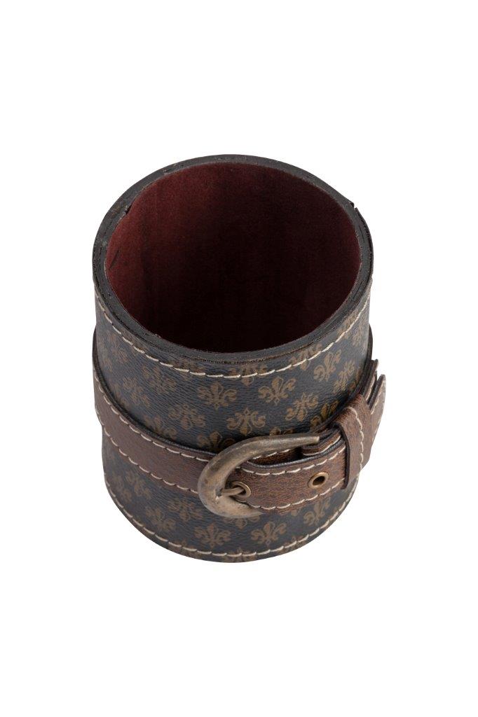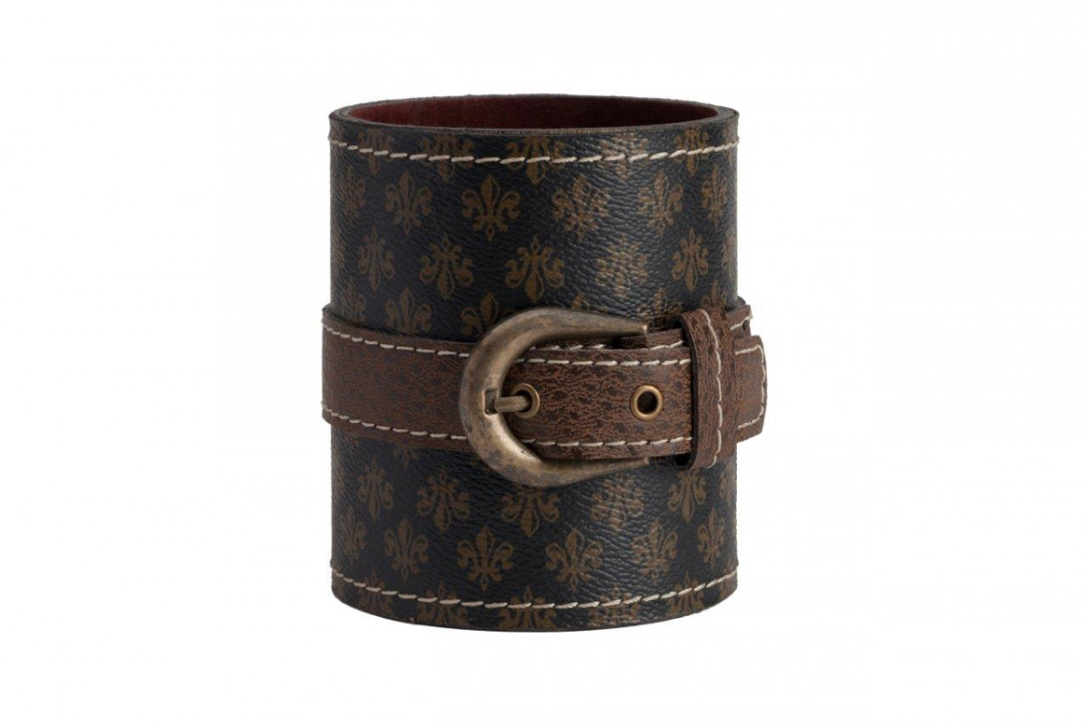 Изящная подставка для ручек Angus, несомненно, станет украшением вашего письменного стола. Подставка выполнена в классическом стиле из дерева, обтянутого коричневой, с рисунком из геральдических лилий, экокожей, декорирована ремешком с красивой пряжкой. Края подставки и ремешок прострочены светлыми нитками, что выгодно дополняет аксессуар. Благодаря элегантному декору, модель смотрится роскошно и эффектно.